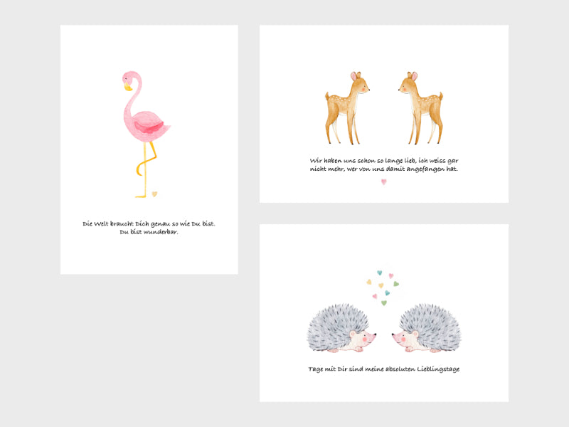 Überrasche deine Liebsten mit einer kleinen Aufmerksamkeit, die direkt aus dem Herzen kommt! Unsere niedlichen und freundlichen Postkarten, gestaltet mit drei bezaubernden Motiven von Flamingo, Reh und Igel, sind die perfekte Möglichkeit, deine Gefühle zum Ausdruck zu bringen. Jede Karte trägt ihre eigene Botschaft: